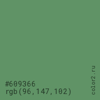 Цвет #609366 в цветовой модели RGB обозначается тремя октетами (96, 147, 102) в десятичном формате и #609366 в шестнадцатиричном (hex) формате, которые являются интенсивностью красного 96 (hex 60), интенсивность зелёного 147 (hex 93) и интенсивность синего 102 (hex 66).