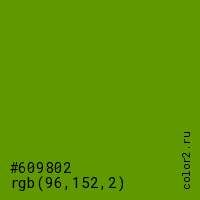 Цвет #609802 в цветовой модели RGB обозначается тремя октетами (96, 152, 2) в десятичном формате и #609802 в шестнадцатиричном (hex) формате, которые являются интенсивностью красного 96 (hex 60), интенсивность зелёного 152 (hex 98) и интенсивность синего 2 (hex 02).