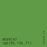 Цвет #609C47 в цветовой модели RGB обозначается тремя октетами (96, 156, 71) в десятичном формате и #609C47 в шестнадцатиричном (hex) формате, которые являются интенсивностью красного 96 (hex 60), интенсивность зелёного 156 (hex 9C) и интенсивность синего 71 (hex 47).