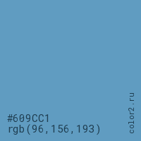 Цвет #609CC1 в цветовой модели RGB обозначается тремя октетами (96, 156, 193) в десятичном формате и #609CC1 в шестнадцатиричном (hex) формате, которые являются интенсивностью красного 96 (hex 60), интенсивность зелёного 156 (hex 9C) и интенсивность синего 193 (hex C1).