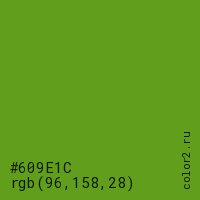 Цвет #609E1C в цветовой модели RGB обозначается тремя октетами (96, 158, 28) в десятичном формате и #609E1C в шестнадцатиричном (hex) формате, которые являются интенсивностью красного 96 (hex 60), интенсивность зелёного 158 (hex 9E) и интенсивность синего 28 (hex 1C).