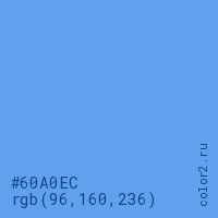 Цвет #60A0EC в цветовой модели RGB обозначается тремя октетами (96, 160, 236) в десятичном формате и #60A0EC в шестнадцатиричном (hex) формате, которые являются интенсивностью красного 96 (hex 60), интенсивность зелёного 160 (hex A0) и интенсивность синего 236 (hex EC).