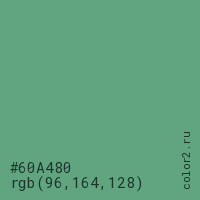 Цвет #60A480 в цветовой модели RGB обозначается тремя октетами (96, 164, 128) в десятичном формате и #60A480 в шестнадцатиричном (hex) формате, которые являются интенсивностью красного 96 (hex 60), интенсивность зелёного 164 (hex A4) и интенсивность синего 128 (hex 80).
