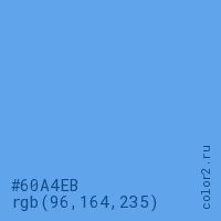 Цвет #60A4EB в цветовой модели RGB обозначается тремя октетами (96, 164, 235) в десятичном формате и #60A4EB в шестнадцатиричном (hex) формате, которые являются интенсивностью красного 96 (hex 60), интенсивность зелёного 164 (hex A4) и интенсивность синего 235 (hex EB).