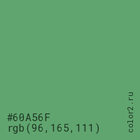 Цвет #60A56F в цветовой модели RGB обозначается тремя октетами (96, 165, 111) в десятичном формате и #60A56F в шестнадцатиричном (hex) формате, которые являются интенсивностью красного 96 (hex 60), интенсивность зелёного 165 (hex A5) и интенсивность синего 111 (hex 6F).