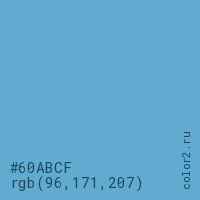Цвет #60ABCF в цветовой модели RGB обозначается тремя октетами (96, 171, 207) в десятичном формате и #60ABCF в шестнадцатиричном (hex) формате, которые являются интенсивностью красного 96 (hex 60), интенсивность зелёного 171 (hex AB) и интенсивность синего 207 (hex CF).