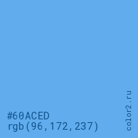 Цвет #60ACED в цветовой модели RGB обозначается тремя октетами (96, 172, 237) в десятичном формате и #60ACED в шестнадцатиричном (hex) формате, которые являются интенсивностью красного 96 (hex 60), интенсивность зелёного 172 (hex AC) и интенсивность синего 237 (hex ED).