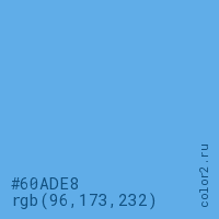 Цвет #60ADE8 в цветовой модели RGB обозначается тремя октетами (96, 173, 232) в десятичном формате и #60ADE8 в шестнадцатиричном (hex) формате, которые являются интенсивностью красного 96 (hex 60), интенсивность зелёного 173 (hex AD) и интенсивность синего 232 (hex E8).