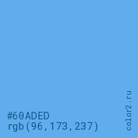Цвет #60ADED в цветовой модели RGB обозначается тремя октетами (96, 173, 237) в десятичном формате и #60ADED в шестнадцатиричном (hex) формате, которые являются интенсивностью красного 96 (hex 60), интенсивность зелёного 173 (hex AD) и интенсивность синего 237 (hex ED).