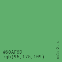 Цвет #60AF6D в цветовой модели RGB обозначается тремя октетами (96, 175, 109) в десятичном формате и #60AF6D в шестнадцатиричном (hex) формате, которые являются интенсивностью красного 96 (hex 60), интенсивность зелёного 175 (hex AF) и интенсивность синего 109 (hex 6D).