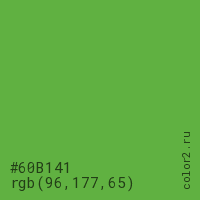 Цвет #60B141 в цветовой модели RGB обозначается тремя октетами (96, 177, 65) в десятичном формате и #60B141 в шестнадцатиричном (hex) формате, которые являются интенсивностью красного 96 (hex 60), интенсивность зелёного 177 (hex B1) и интенсивность синего 65 (hex 41).