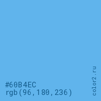 Цвет #60B4EC в цветовой модели RGB обозначается тремя октетами (96, 180, 236) в десятичном формате и #60B4EC в шестнадцатиричном (hex) формате, которые являются интенсивностью красного 96 (hex 60), интенсивность зелёного 180 (hex B4) и интенсивность синего 236 (hex EC).