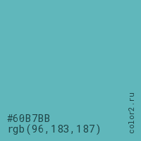 Цвет #60B7BB в цветовой модели RGB обозначается тремя октетами (96, 183, 187) в десятичном формате и #60B7BB в шестнадцатиричном (hex) формате, которые являются интенсивностью красного 96 (hex 60), интенсивность зелёного 183 (hex B7) и интенсивность синего 187 (hex BB).