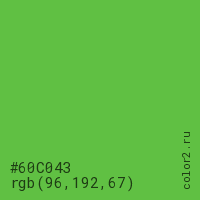 Цвет #60C043 в цветовой модели RGB обозначается тремя октетами (96, 192, 67) в десятичном формате и #60C043 в шестнадцатиричном (hex) формате, которые являются интенсивностью красного 96 (hex 60), интенсивность зелёного 192 (hex C0) и интенсивность синего 67 (hex 43).