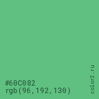 Цвет #60C082 в цветовой модели RGB обозначается тремя октетами (96, 192, 130) в десятичном формате и #60C082 в шестнадцатиричном (hex) формате, которые являются интенсивностью красного 96 (hex 60), интенсивность зелёного 192 (hex C0) и интенсивность синего 130 (hex 82).