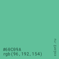 Цвет #60C09A в цветовой модели RGB обозначается тремя октетами (96, 192, 154) в десятичном формате и #60C09A в шестнадцатиричном (hex) формате, которые являются интенсивностью красного 96 (hex 60), интенсивность зелёного 192 (hex C0) и интенсивность синего 154 (hex 9A).