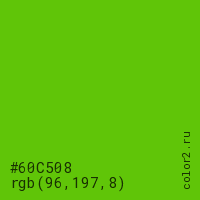 Цвет #60C508 в цветовой модели RGB обозначается тремя октетами (96, 197, 8) в десятичном формате и #60C508 в шестнадцатиричном (hex) формате, которые являются интенсивностью красного 96 (hex 60), интенсивность зелёного 197 (hex C5) и интенсивность синего 8 (hex 08).