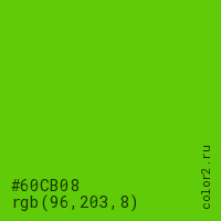Цвет #60CB08 в цветовой модели RGB обозначается тремя октетами (96, 203, 8) в десятичном формате и #60CB08 в шестнадцатиричном (hex) формате, которые являются интенсивностью красного 96 (hex 60), интенсивность зелёного 203 (hex CB) и интенсивность синего 8 (hex 08).