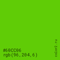 Цвет #60CC06 в цветовой модели RGB обозначается тремя октетами (96, 204, 6) в десятичном формате и #60CC06 в шестнадцатиричном (hex) формате, которые являются интенсивностью красного 96 (hex 60), интенсивность зелёного 204 (hex CC) и интенсивность синего 6 (hex 06).