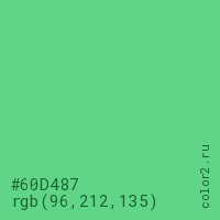 Цвет #60D487 в цветовой модели RGB обозначается тремя октетами (96, 212, 135) в десятичном формате и #60D487 в шестнадцатиричном (hex) формате, которые являются интенсивностью красного 96 (hex 60), интенсивность зелёного 212 (hex D4) и интенсивность синего 135 (hex 87).