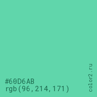 Цвет #60D6AB в цветовой модели RGB обозначается тремя октетами (96, 214, 171) в десятичном формате и #60D6AB в шестнадцатиричном (hex) формате, которые являются интенсивностью красного 96 (hex 60), интенсивность зелёного 214 (hex D6) и интенсивность синего 171 (hex AB).