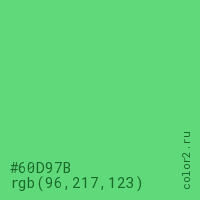 Цвет #60D97B в цветовой модели RGB обозначается тремя октетами (96, 217, 123) в десятичном формате и #60D97B в шестнадцатиричном (hex) формате, которые являются интенсивностью красного 96 (hex 60), интенсивность зелёного 217 (hex D9) и интенсивность синего 123 (hex 7B).