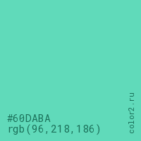 Цвет #60DABA в цветовой модели RGB обозначается тремя октетами (96, 218, 186) в десятичном формате и #60DABA в шестнадцатиричном (hex) формате, которые являются интенсивностью красного 96 (hex 60), интенсивность зелёного 218 (hex DA) и интенсивность синего 186 (hex BA).