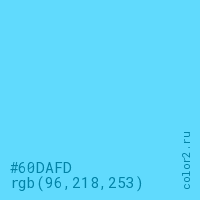 Цвет #60DAFD в цветовой модели RGB обозначается тремя октетами (96, 218, 253) в десятичном формате и #60DAFD в шестнадцатиричном (hex) формате, которые являются интенсивностью красного 96 (hex 60), интенсивность зелёного 218 (hex DA) и интенсивность синего 253 (hex FD).