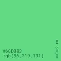 Цвет #60DB83 в цветовой модели RGB обозначается тремя октетами (96, 219, 131) в десятичном формате и #60DB83 в шестнадцатиричном (hex) формате, которые являются интенсивностью красного 96 (hex 60), интенсивность зелёного 219 (hex DB) и интенсивность синего 131 (hex 83).
