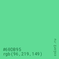 Цвет #60DB95 в цветовой модели RGB обозначается тремя октетами (96, 219, 149) в десятичном формате и #60DB95 в шестнадцатиричном (hex) формате, которые являются интенсивностью красного 96 (hex 60), интенсивность зелёного 219 (hex DB) и интенсивность синего 149 (hex 95).