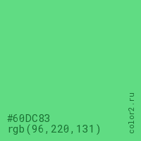 Цвет #60DC83 в цветовой модели RGB обозначается тремя октетами (96, 220, 131) в десятичном формате и #60DC83 в шестнадцатиричном (hex) формате, которые являются интенсивностью красного 96 (hex 60), интенсивность зелёного 220 (hex DC) и интенсивность синего 131 (hex 83).