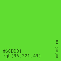 Цвет #60DD31 в цветовой модели RGB обозначается тремя октетами (96, 221, 49) в десятичном формате и #60DD31 в шестнадцатиричном (hex) формате, которые являются интенсивностью красного 96 (hex 60), интенсивность зелёного 221 (hex DD) и интенсивность синего 49 (hex 31).