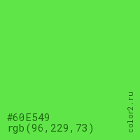 Цвет #60E549 в цветовой модели RGB обозначается тремя октетами (96, 229, 73) в десятичном формате и #60E549 в шестнадцатиричном (hex) формате, которые являются интенсивностью красного 96 (hex 60), интенсивность зелёного 229 (hex E5) и интенсивность синего 73 (hex 49).