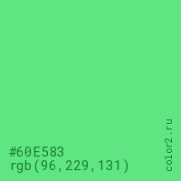 Цвет #60E583 в цветовой модели RGB обозначается тремя октетами (96, 229, 131) в десятичном формате и #60E583 в шестнадцатиричном (hex) формате, которые являются интенсивностью красного 96 (hex 60), интенсивность зелёного 229 (hex E5) и интенсивность синего 131 (hex 83).