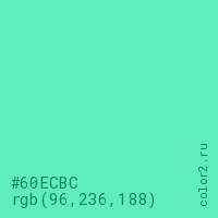 Цвет #60ECBC в цветовой модели RGB обозначается тремя октетами (96, 236, 188) в десятичном формате и #60ECBC в шестнадцатиричном (hex) формате, которые являются интенсивностью красного 96 (hex 60), интенсивность зелёного 236 (hex EC) и интенсивность синего 188 (hex BC).