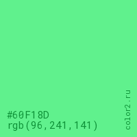 Цвет #60F18D в цветовой модели RGB обозначается тремя октетами (96, 241, 141) в десятичном формате и #60F18D в шестнадцатиричном (hex) формате, которые являются интенсивностью красного 96 (hex 60), интенсивность зелёного 241 (hex F1) и интенсивность синего 141 (hex 8D).