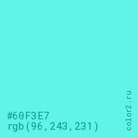 Цвет #60F3E7 в цветовой модели RGB обозначается тремя октетами (96, 243, 231) в десятичном формате и #60F3E7 в шестнадцатиричном (hex) формате, которые являются интенсивностью красного 96 (hex 60), интенсивность зелёного 243 (hex F3) и интенсивность синего 231 (hex E7).