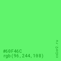 Цвет #60F46C в цветовой модели RGB обозначается тремя октетами (96, 244, 108) в десятичном формате и #60F46C в шестнадцатиричном (hex) формате, которые являются интенсивностью красного 96 (hex 60), интенсивность зелёного 244 (hex F4) и интенсивность синего 108 (hex 6C).