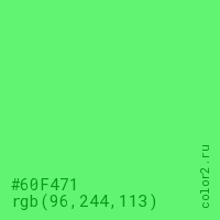 Цвет #60F471 в цветовой модели RGB обозначается тремя октетами (96, 244, 113) в десятичном формате и #60F471 в шестнадцатиричном (hex) формате, которые являются интенсивностью красного 96 (hex 60), интенсивность зелёного 244 (hex F4) и интенсивность синего 113 (hex 71).