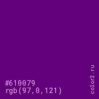 Цвет #610079 в цветовой модели RGB обозначается тремя октетами (97, 0, 121) в десятичном формате и #610079 в шестнадцатиричном (hex) формате, которые являются интенсивностью красного 97 (hex 61), интенсивность зелёного 0 (hex 00) и интенсивность синего 121 (hex 79).