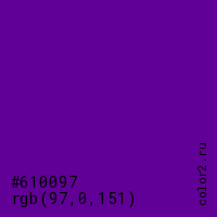 Цвет #610097 в цветовой модели RGB обозначается тремя октетами (97, 0, 151) в десятичном формате и #610097 в шестнадцатиричном (hex) формате, которые являются интенсивностью красного 97 (hex 61), интенсивность зелёного 0 (hex 00) и интенсивность синего 151 (hex 97).