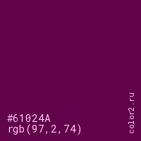 Цвет #61024A в цветовой модели RGB обозначается тремя октетами (97, 2, 74) в десятичном формате и #61024A в шестнадцатиричном (hex) формате, которые являются интенсивностью красного 97 (hex 61), интенсивность зелёного 2 (hex 02) и интенсивность синего 74 (hex 4A).