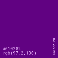 Цвет #610282 в цветовой модели RGB обозначается тремя октетами (97, 2, 130) в десятичном формате и #610282 в шестнадцатиричном (hex) формате, которые являются интенсивностью красного 97 (hex 61), интенсивность зелёного 2 (hex 02) и интенсивность синего 130 (hex 82).