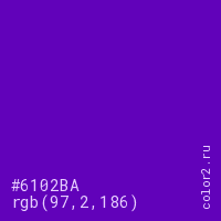 Цвет #6102BA в цветовой модели RGB обозначается тремя октетами (97, 2, 186) в десятичном формате и #6102BA в шестнадцатиричном (hex) формате, которые являются интенсивностью красного 97 (hex 61), интенсивность зелёного 2 (hex 02) и интенсивность синего 186 (hex BA).