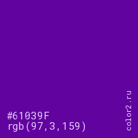 Цвет #61039F в цветовой модели RGB обозначается тремя октетами (97, 3, 159) в десятичном формате и #61039F в шестнадцатиричном (hex) формате, которые являются интенсивностью красного 97 (hex 61), интенсивность зелёного 3 (hex 03) и интенсивность синего 159 (hex 9F).