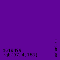 Цвет #610499 в цветовой модели RGB обозначается тремя октетами (97, 4, 153) в десятичном формате и #610499 в шестнадцатиричном (hex) формате, которые являются интенсивностью красного 97 (hex 61), интенсивность зелёного 4 (hex 04) и интенсивность синего 153 (hex 99).