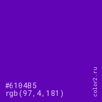 Цвет #6104B5 в цветовой модели RGB обозначается тремя октетами (97, 4, 181) в десятичном формате и #6104B5 в шестнадцатиричном (hex) формате, которые являются интенсивностью красного 97 (hex 61), интенсивность зелёного 4 (hex 04) и интенсивность синего 181 (hex B5).