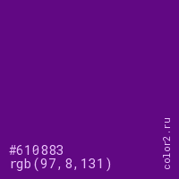 Цвет #610883 в цветовой модели RGB обозначается тремя октетами (97, 8, 131) в десятичном формате и #610883 в шестнадцатиричном (hex) формате, которые являются интенсивностью красного 97 (hex 61), интенсивность зелёного 8 (hex 08) и интенсивность синего 131 (hex 83).