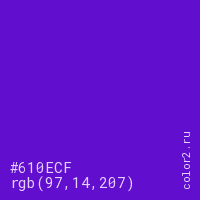 Цвет #610ECF в цветовой модели RGB обозначается тремя октетами (97, 14, 207) в десятичном формате и #610ECF в шестнадцатиричном (hex) формате, которые являются интенсивностью красного 97 (hex 61), интенсивность зелёного 14 (hex 0E) и интенсивность синего 207 (hex CF).
