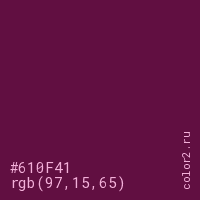 Цвет #610F41 в цветовой модели RGB обозначается тремя октетами (97, 15, 65) в десятичном формате и #610F41 в шестнадцатиричном (hex) формате, которые являются интенсивностью красного 97 (hex 61), интенсивность зелёного 15 (hex 0F) и интенсивность синего 65 (hex 41).